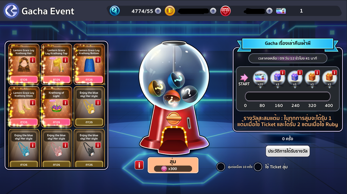 🔸เมื่อสะสมแต้ม Gacha ครบ 400 แต้มแล้ว ระบบจะ reset ให้สามารถสะสมแต้มเพื่อรับของรางวัลได้อีกครั้ง