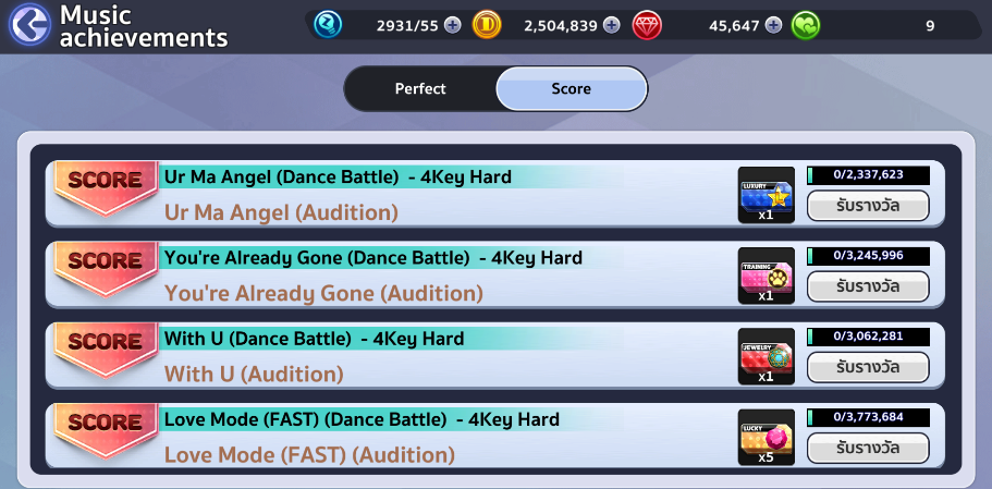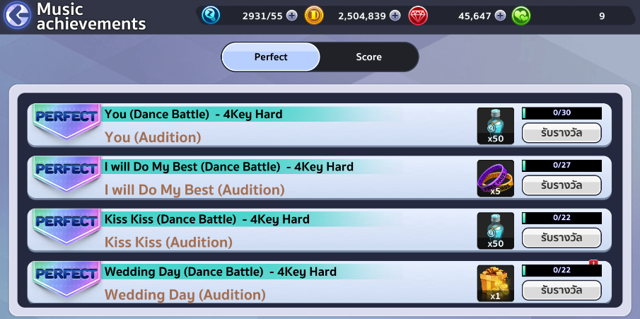 🔸ไม่สามารถสะสม Score หรือ perfect ได้ ต้องเล่นให้ได้ score หรือ perfect ตามที่กำหนด ภายใน 1 เพลงเท่านั้น
