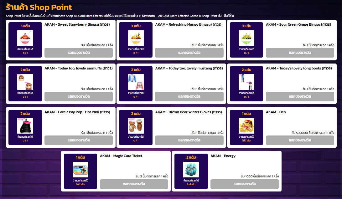 🔸การสุ่มไอเทมซ้ำและได้รับ Shop Point จะนับเฉพาะไอเทมที่มาจากระบบการสุ่มกาชา เท่านั้น ไม่รวมกับการรับไอเทมใน Redeem Shop